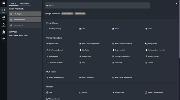 Click ‘New question’ in the left sidebar to open the question types library. You’ll have a huge selection of questions and fields for your calculators, including: